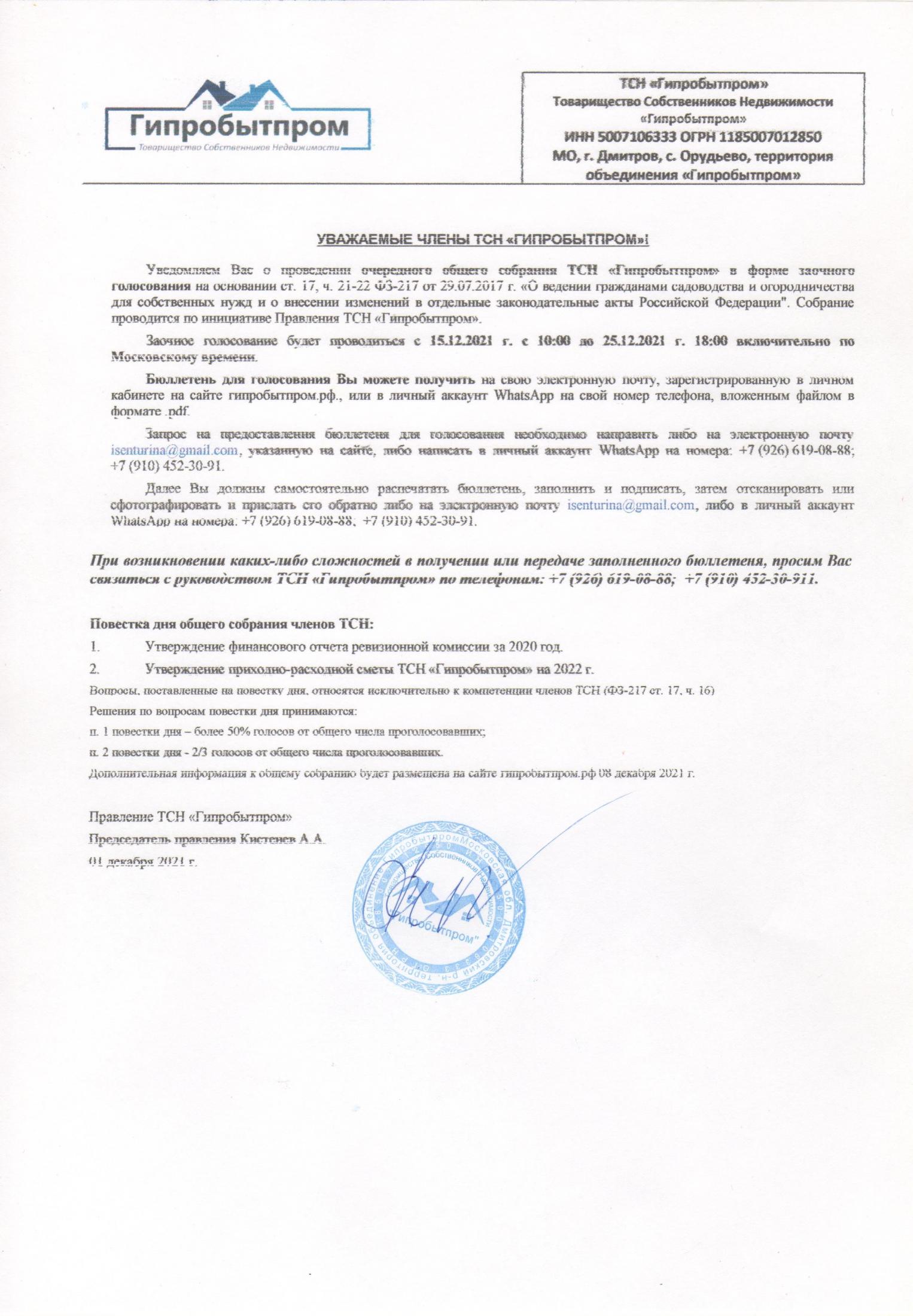 Сообщение о проведении общего собрания членов Товарищества